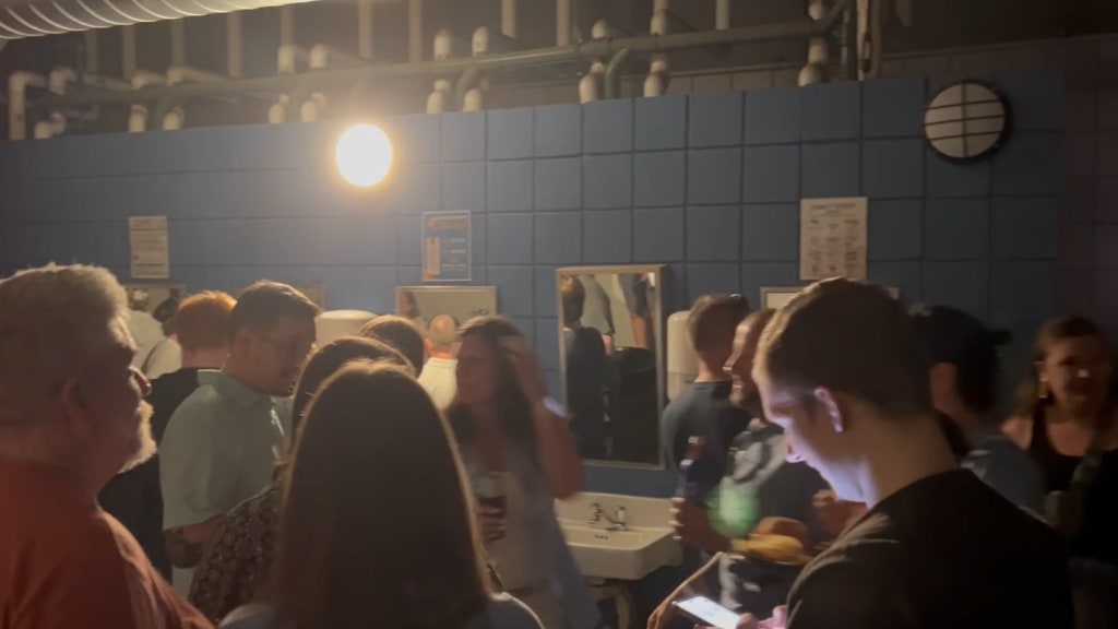 However! Before the ballgame could begin, a mighty thunderstorm blew in and the power at the ballpark went out. I sought shelter from the deluge on the concourse and, amid a crush of people illuminated by the harsh glare of emergency lighting, soon opted for the safety of the men's room. Dozens more joined me, with no regard for gender distinction, seeking refuge from nature as opposed to heeding its call.