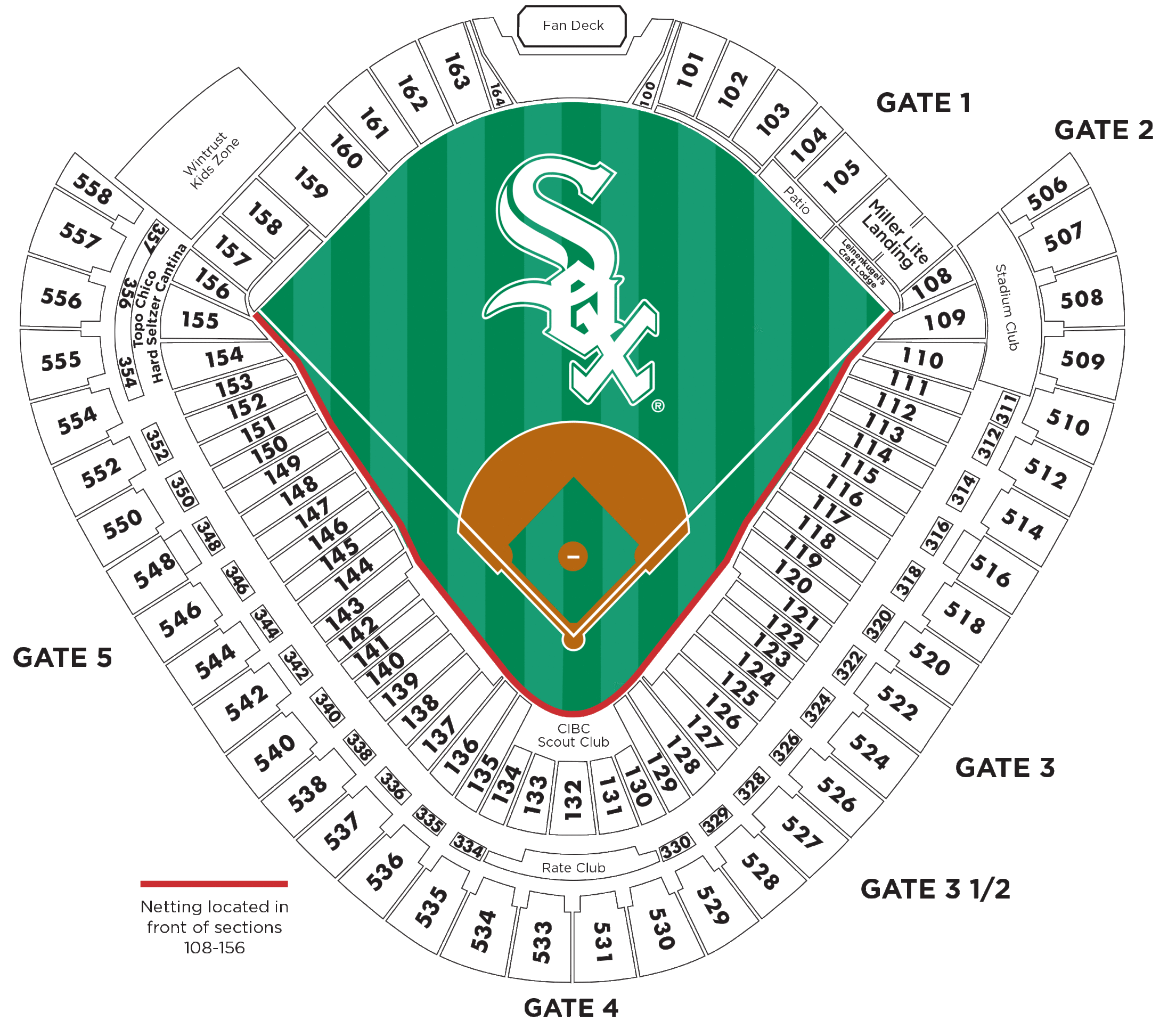 Following our goal to create a safe environment at Rate Field, some amount of netting or screening is in front of 49 sections (Sections 108-156); the height and coverage of netting or screening will vary by section.