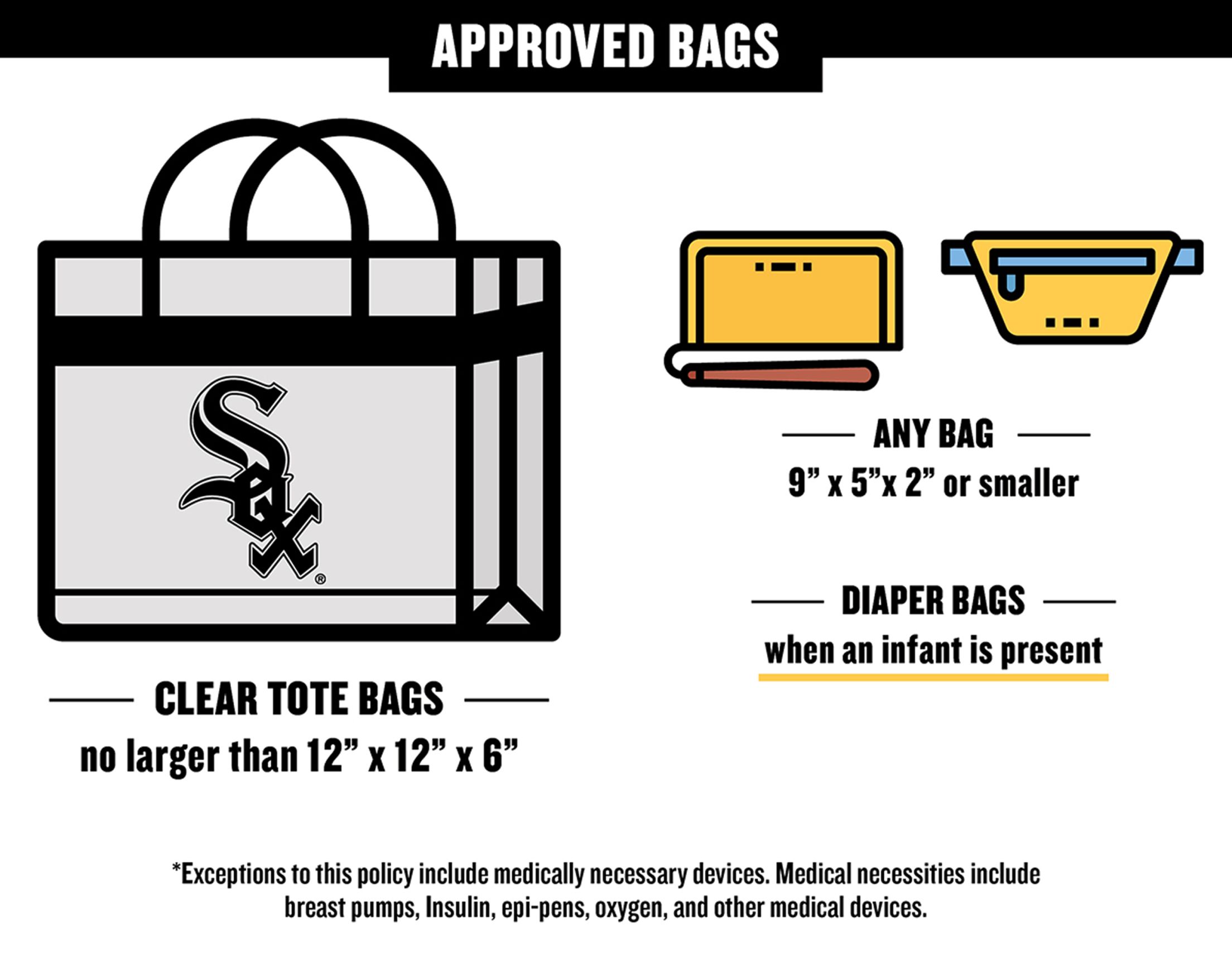 - Packing your own snacks? Food items in clear zip-lock bags (1 GAL) are permitted, along with sealed water bottles (1 L). Parents also can visit the White Sox allergen guide and view concessions areas accommodating any dietary restrictions.