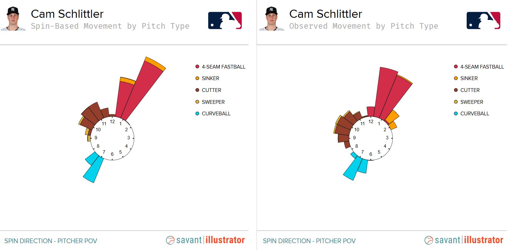 The images below show Schlittler’s spin profile, comparing the spin-based movement out of the pitcher’s hand (left) with the observed movement from spin direction at the plate (right). The four-seamer (bright red) and sinker (orange) look the same to the hitter when Schlittler first releases them; by the time they get to the plate, they are behaving differently. The sinker has more horizontal movement than Schlittler’s cut-ride four-seamer. The cutter (dark red) changes on its way to the plate, too; it’s released at a 10:45 spin direction -- each “slice” is 30 minutes -- and arrives at the plate at 9:45.