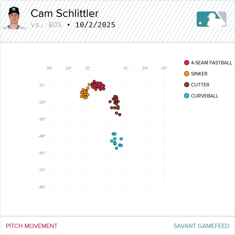 Against Boston, Schlittler had all three fastballs working in concert with one another. He induced 11 whiffs on 26 swings against his four-seamer, pounding his heater up in the zone. He threw 25 sinkers -- 12 more than he had ever thrown in a single game -- with a 36% usage rate against right-handed hitters. The cutter kept both sided hitters off balance, inducing soft contact on four balls in play.