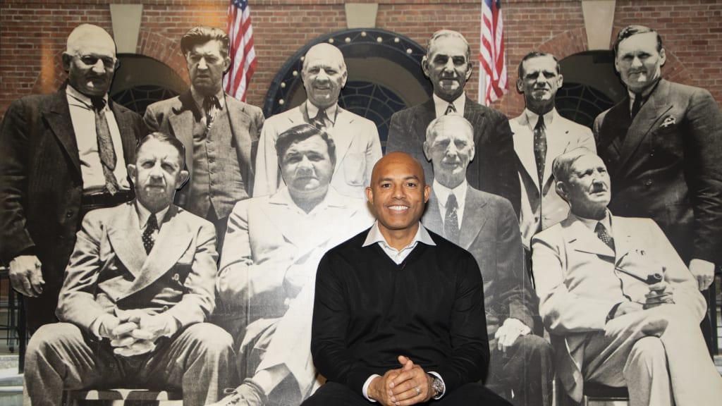 After spending a few more minutes in that room, Strohl brought Rivera to a wooden bench situated in front of a life-size photo of the first Hall of Fame class from 1936. As Rivera sat down on the bench for a photo op, he was careful not to sit directly in front of one important player.