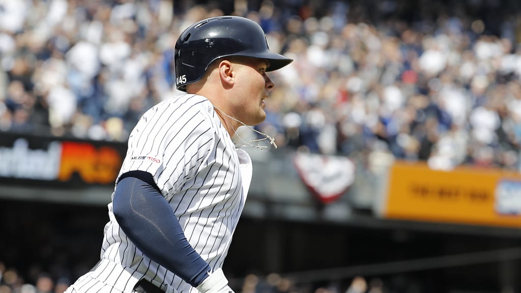 \n","providerName":"Twitter","providerUrl":"https://twitter.com","thumbnail_url":null,"type":"oembed","width":550,"contentType":"rich"},{"__typename":"Markdown","content":"As one of the game’s biggest stars, Aaron Judge has no shortage of gear in his locker that marketing executives pray he gets photographed wearing. Adidas reps must have taken notice of the Yogi Berra/Baseballism “Yo8i” T-shirt that Judge wore underneath his uniform every day in 2018; this year they supplied him with undershirts featuring the “AJ99” logo -- complete with inset gavel -- that they designed for him.\n\n“They just come up with whatever they can,” he says, grateful for the company’s creativity, yet a bit bashful about having his own likeness stamped on his chest. For Judge, choosing gear is based more on performance than anything else. Scanning the contents of his locker stall a few hours before first pitch on Opening Day, he says that he might use a pair of sunglasses from last year that he likes, but everything else is new -- and is chosen with on-field success in mind. He wears basketball-style shoes, not just because they look cool, but because they’re easy to get in a bigger size and offer greater support.\n\n“Everyone’s always coming out with new technology and better performing shoes or arm sleeves or whatever they got, so I always try to go with the latest and newest if I can,” Judge says.\n\nWith so many options, how does the All-Star outfielder choose which cleats to wear in the game that day?\n\n“If they’re lucky, you roll with them,” he says, grinning. “If you’re not feeling them that day -- baseball players are superstitious, so, we just roll with what we’re feeling.”\n\nDJ LeMahieu knows exactly what Judge means. “I try not to be too superstitious with that stuff,” the infielder says, not long after explaining that if he’s hitting well, he’ll stick with the same 34-inch, 32-ounce Marucci bat. If not, that bat goes back in the rack. “Same with the cleats. I’ll kind of roll with them as long as I’m playing well and the team’s playing well, but switch it up if we need to switch,” LeMahieu says. “I guess all of it ties to playing well.”\n\nAfter coming over from the Rockies, the 30-year-old was outfitted for all new threads during Spring Training. Putting on a Yankees uniform for the first time was “pretty cool,” LeMahieu says. “It’s special to wear that logo.” There was one piece of gear, however, that _had_ to make the trip from Colorado to the Bronx.\n\n“I try to keep my glove as long as I can,” he says. “I think this will be my fourth year with it.” Using a tan Rawlings gamer that looks no different from one you might find at the local sporting goods store, LeMahieu won three of the last five National League Gold Glove Awards at second base, including the last two in a row.\n\n“I can’t get rid of it.”\n\nGlove colors run the gamut, at least among the non-pitchers. The teal outfielder’s glove that Judge is breaking in wouldn’t fly on the mound, where it could be considered a distraction to the hitter. Pitchers’ attire is a little more tightly regulated, so hurlers find subtle ways to personalize their gloves, often having inscriptions sewn into the leather. Sabathia has had “RIP N.B.” on his glove ever since his 25-year-old cousin, Nate Berhel, died in 2004. Luis Severino can find inspiration any time he needs it by looking down at his glove and seeing his daughter Abigail’s name on it. On the inside of Masahiro Tanaka’s glove, Japanese characters remind the pitcher that pouring his heart and soul into his craft is what has set him apart throughout a terrific career in Japan and the U.S. \n\nZack Britton has worn the same glove since he was in A-ball more than a decade ago, for no reason other than that it has stayed in good shape. But around the same time that he began using the black Wilson model, he started wearing something else that has remained a part of his game-day uniform ever since. In 2007, his close childhood friend, Sandi Stephens, was killed. They had grown up going to church together; their older brothers were friends with each other. And so after Stephens died, Britton had a T-shirt made up honoring her.\n\n“We were really close; I still talk to her dad,” the reliever says. “I’ve worn that shirt my whole career to pitch in. It’s just a nice way to remember her.”\n\nLuke Voit typically eschews any sort of undershirt, “Except for maybe today because it’s freezing,” he says before an early April game against Detroit. Most days, he’ll leave the top button of his jersey undone, giving his ample chest room to breathe and allowing his two chains -- one from his grandma and granddad, who passed away; the other a wedding gift he received from his wife, Tori, this past offseason -- to fly free.\n\nVoit swings a 34-inch, 32-ounce Sam Bat, but only after he tapes it up perfectly with Lizard Skins; he’ll redo it if it doesn’t feel just right. The 28-year-old slugger has enjoyed a successful run since joining the Yankees last summer, but he’s hardly immune from the superstitious mindset that infects most hitters’ brains.\n\n“If I have an older bat that might have some hits in it still, I’ll keep using it, but I don’t know, I get weird,” he says. “Like, if I have a bad game, then I’ll go to another bat; I’ll just kind of rotate them. I’ve got like three different cleats. If I do good, I keep wearing them. If I don’t, switch ’em out. Same with my socks and arm sleeves, too. We have the blue, and the dark blue colors, black or whatever, so I kind of rotate them. If I have a crap game, then, ‘Eh, that color didn’t work out too well.’”","type":"text"},{"__typename":"Image","caption":null,"contextualCaption":null,"contextualAspectRatio":null,"credit":"New York Yankees","contentType":"Photography","format":"jpg","templateUrl":"https://img.mlbstatic.