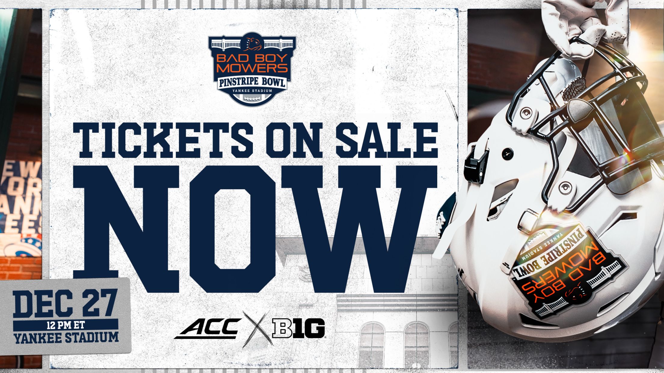Tickets for the 2025 Bad Boy Mowers Pinstripe Bowl will go on sale to the general public on Thursday, Nov. 20, at 10 a.m. The terms and conditions of your ticket and policies applicable to use are updated to address COVID-19 and health & safety. By purchasing a Pinstripe Bowl ticket, you accept these Terms and Conditions and policies applicable to use.