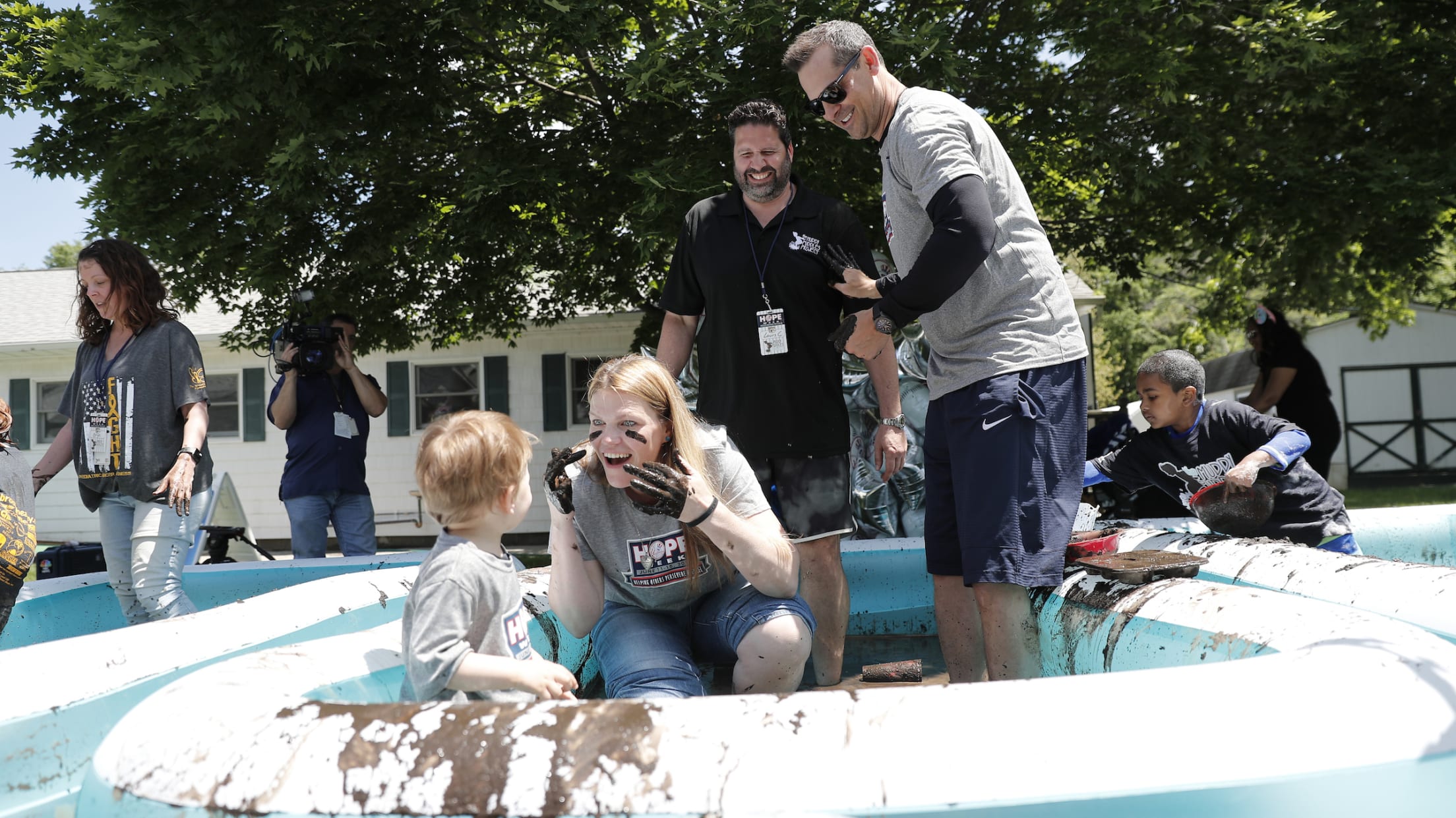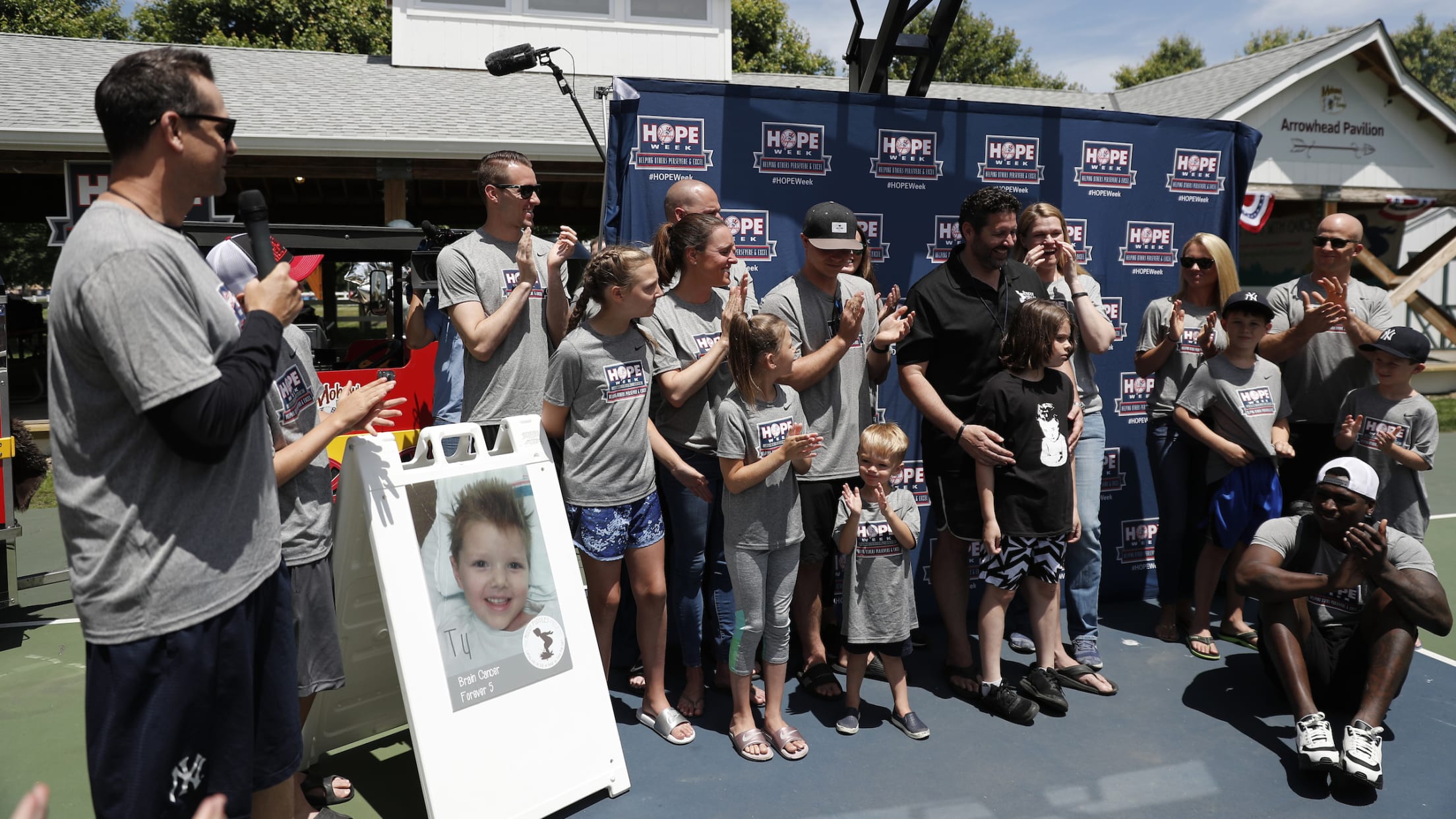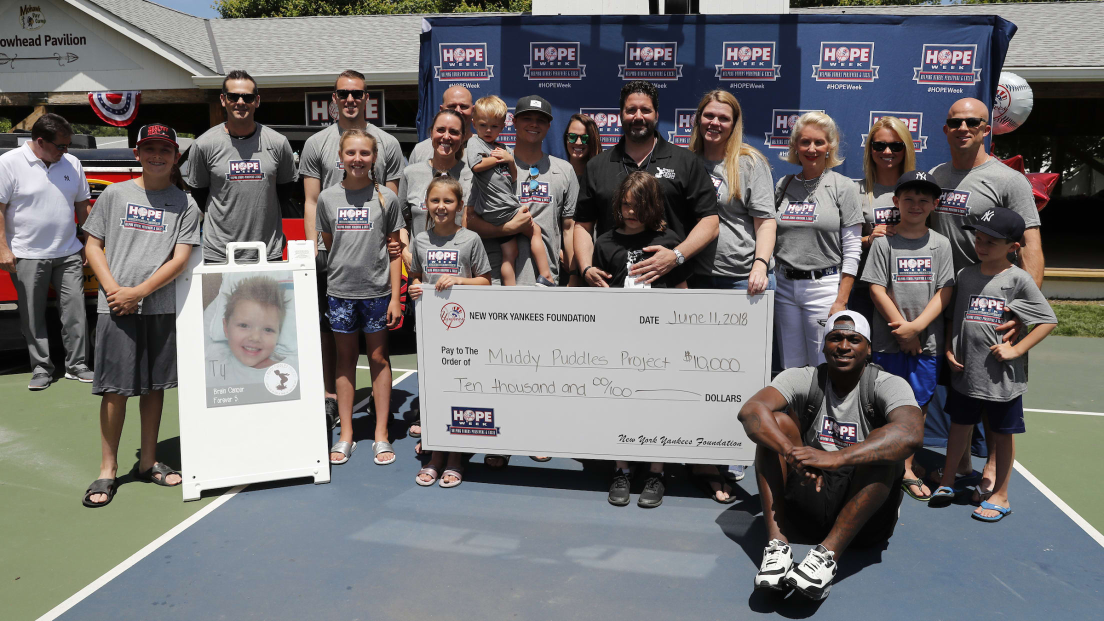 Earlier today, HOPE Week 2018 kicked off with Manager Aaron Boone, Brett Gardner, Sonny Gray, Didi Gregorius, bench coach Josh Bard, NYCFC Goalkeeper Brad Stuver and the founders of the Muddy Puddles Project, Cindy and Louis Campbell, surprising families that have been affected by pediatric cancer at Mohawk Day Camp. The group participated in a "Mess Fest" that included playing in mud and foam pits, "pie-face" and water fights.